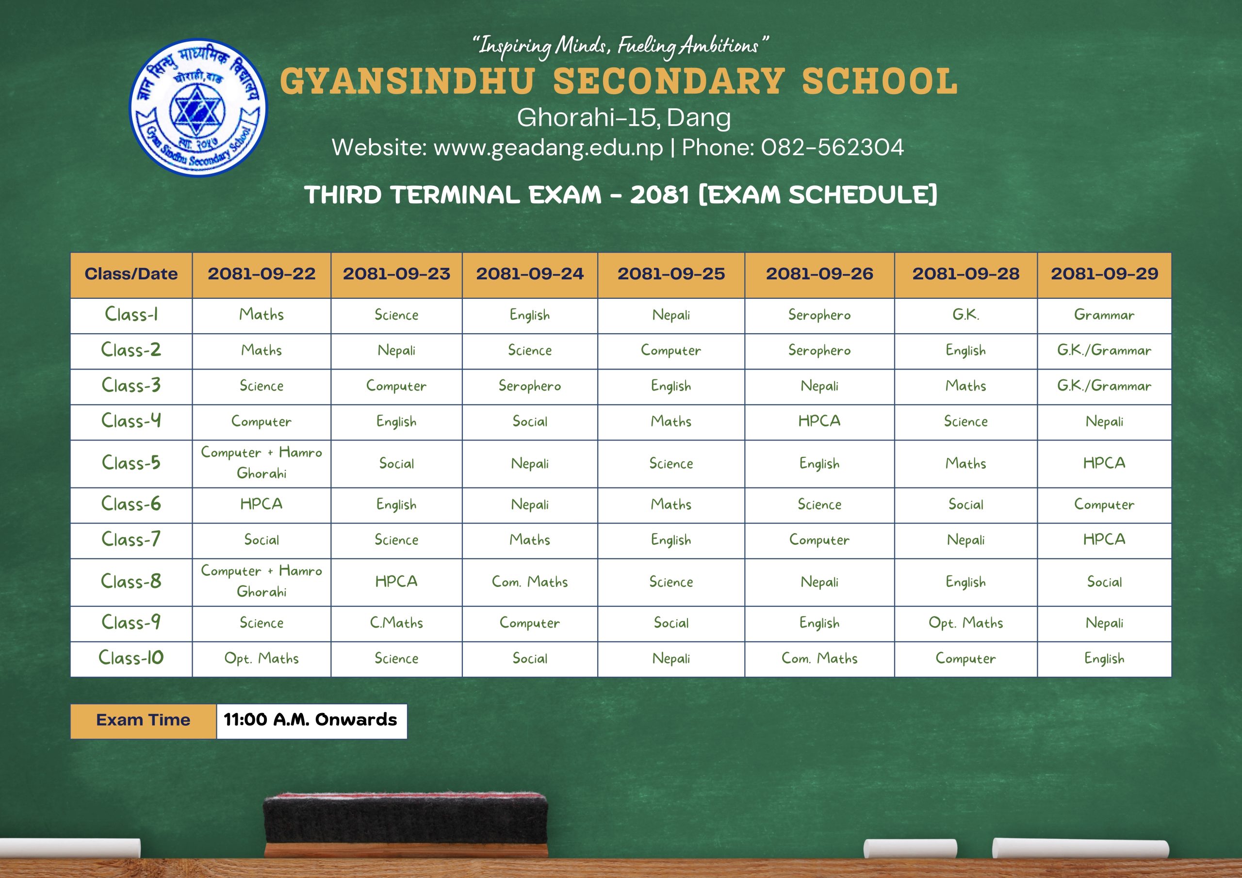 This is to inform all students, parents, and guardians that the Third Terminal Examination for the academic year will commence from Poush 22 and conclude on Poush 29.